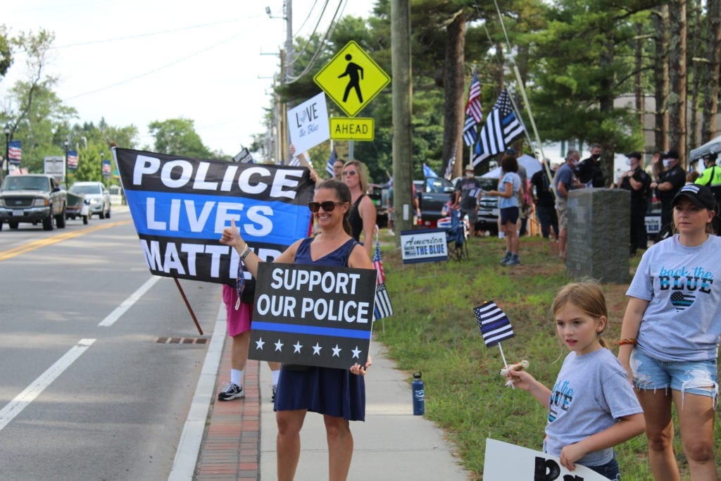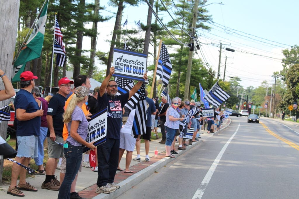 Dozens of people lined Main Street in Carver for a Back the Blue rally. Photo credit: Lenny Rowe.