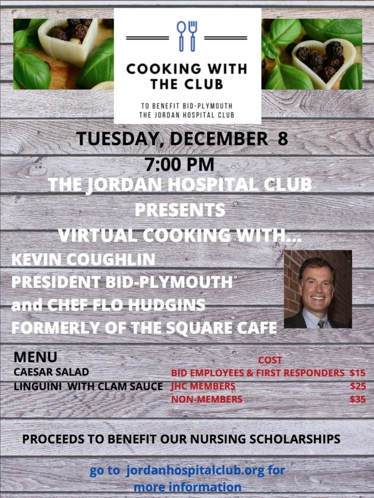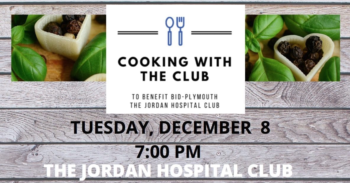The Jordan Hospital Club presents Cooking with the Club to benefit BID-Plymouth on Tuesday, December 8th at 7 PM. This virtual cooking course helps fund BID-Plymouth nursing scholarships.