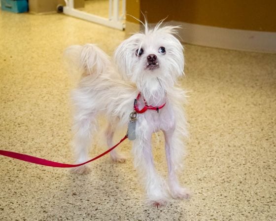 Fluffy loves his people! He bonds very quickly with his care givers and wants to be with them at all times. Fluffy has gained some confidence and has shown a bit of a spicy side! He is great with “his people” but not a fan of strangers. Fluffy will go to nip someone he does not know well. His ideal home will have few visitors. He does seem to have some separation anxiety and will yip and bark when left alone. Eventually he does calm down. Fluffy is nervous around men. He will growl and may snip in the beginning, but given time he does warm up.