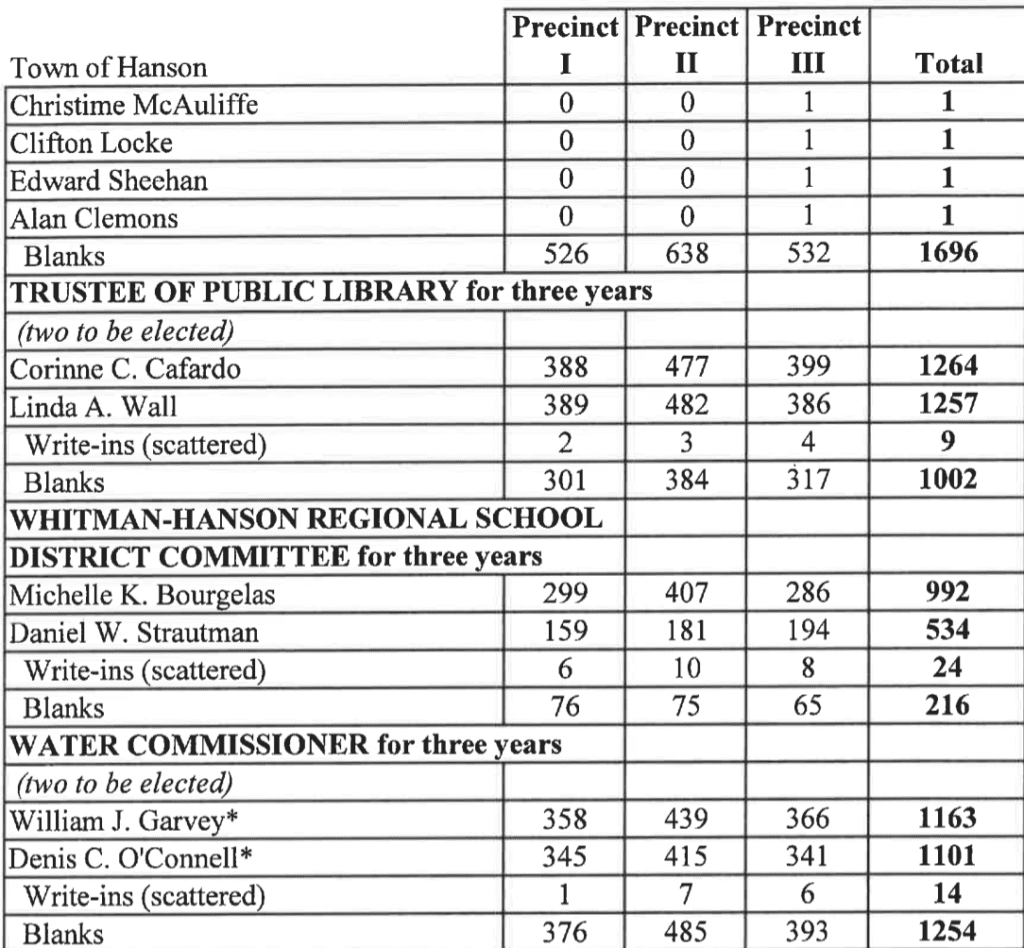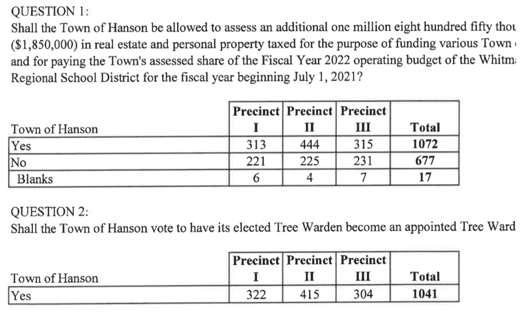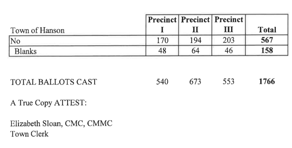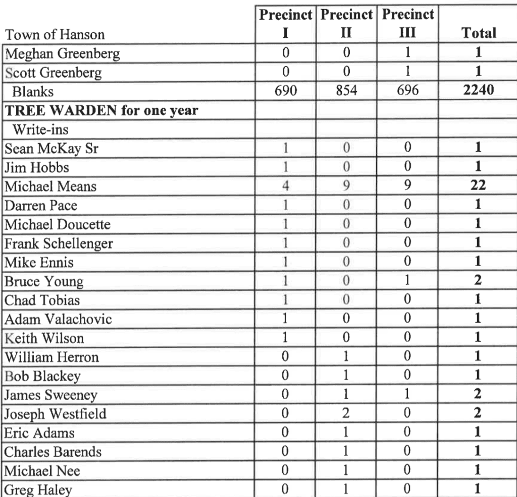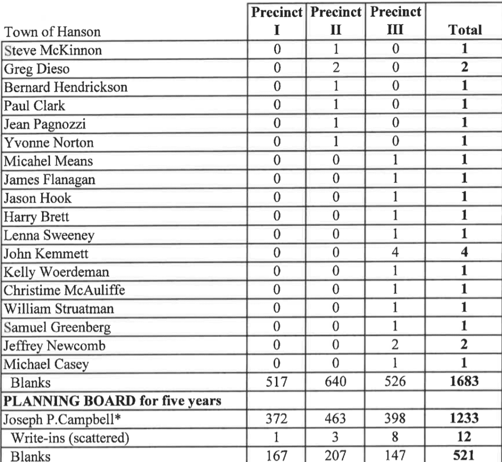 Unofficial Hanson Town Election Results