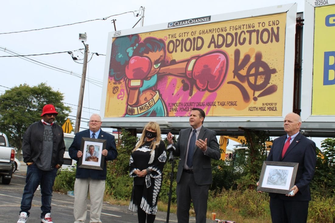 From left: Roxie artist Merk Aveli, Plymouth County Sheriff Joe McDonald, Susie Lordi of 24 Hour Power, Brockton Mayor Robert Sullivan, and District Attorney Tim Cruz. Photo credit: Lenny Rowe.