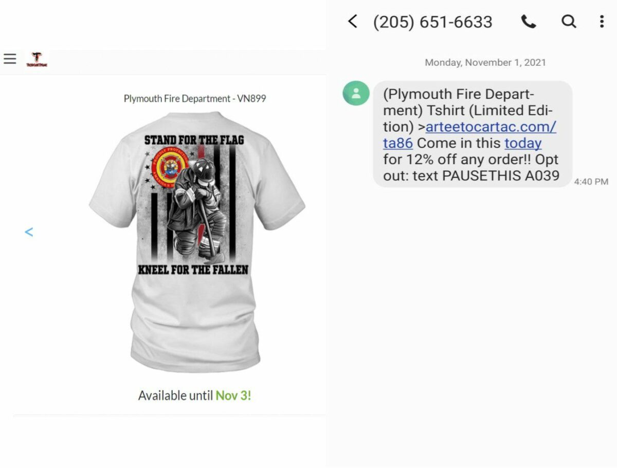 “No, we don’t sell T-shirts this way,” said Plymouth Fire Chief Ed Bradley. “The crews keep some at the stations. If they’re available, they’ll sell them to people who walk in. We don’t do anything by email, especially not by text.”