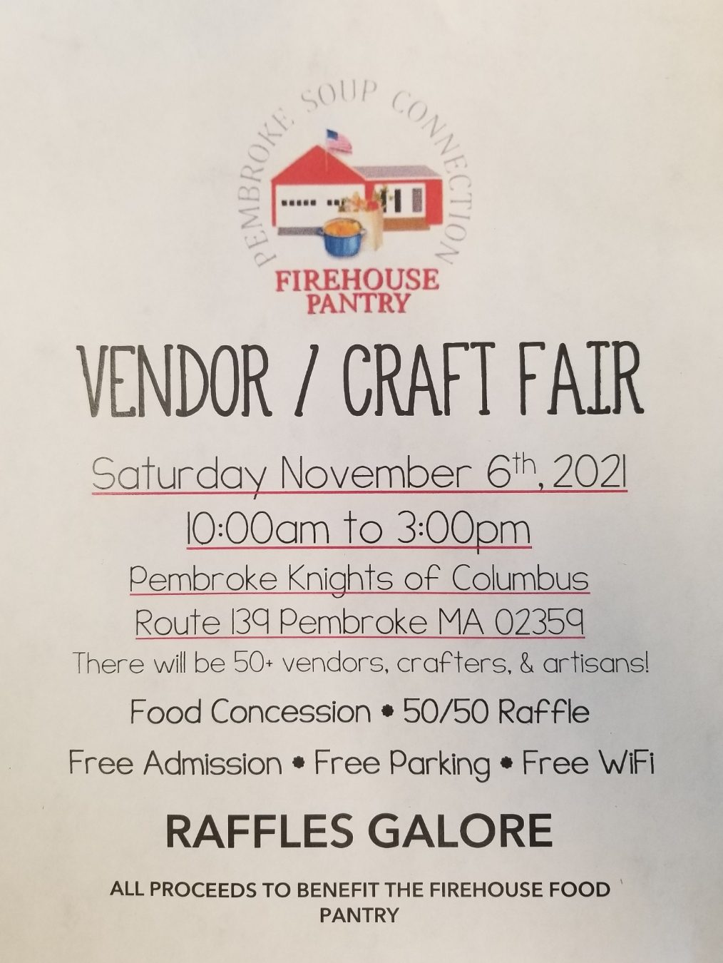 On Saturday from 10 a.m. to 3 p.m., a vendor/craft fair will be taking place at the Pembroke Knights of Columbus, with all proceeds going to the Firehouse Food Pantry.