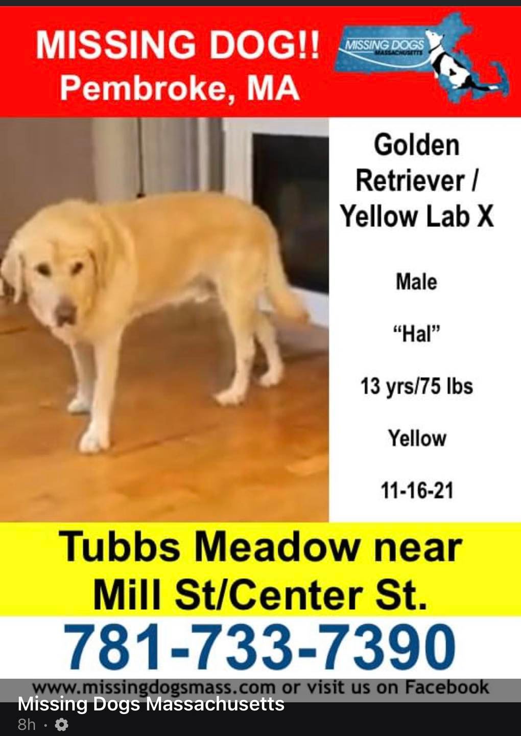 According to Pembroke Animal Control, Hal is missing from Tubbs Meadow, near Mill and Center Streets. People should not call or chase him.