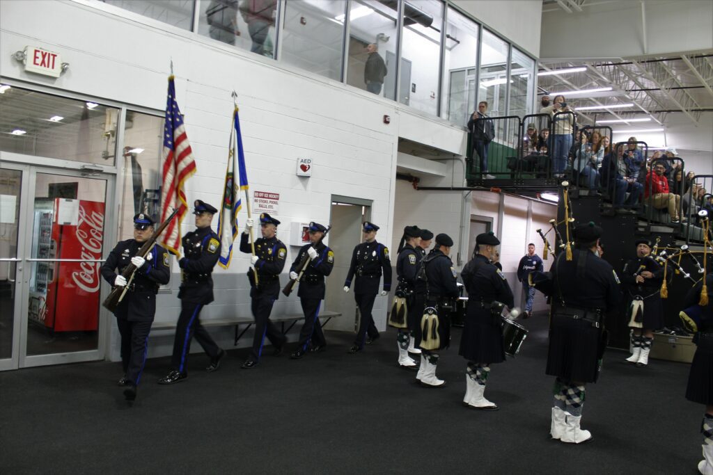 The Boston Police Gaelic Column of Pipes and Drums introduced Old Colony Police and Fire as they took to the ice against the Plymouth Police and Fire Departments.
