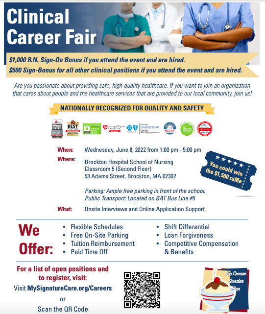 A Clinical Career Fair will be held on Wednesday, June 8th at the Brockton Hospital School of Nursing from 1 – 5 PM.
