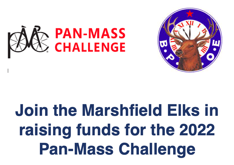 Join the Marshfield Elks in raising funds for the 2022 Pan-Mass Challenge on Friday, July 29th from 6:30 – 10:00 PM at the Elks Lodge, 1321 Ocean St, Marshfield.