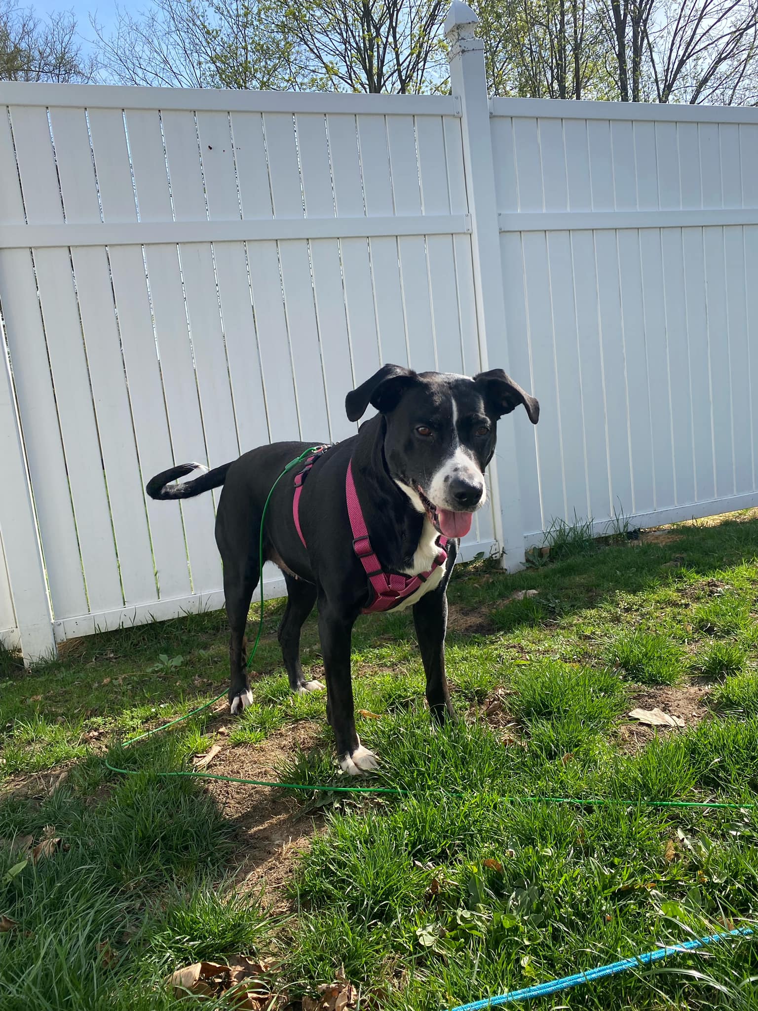 Callie would do best in an only pet home with adults or kids 10+ years old. Callie is a big girl — at her last veterinary appointment she weighed around 87 pounds — and can sometimes be a bit of a bulldozer so best to avoid a home with younger kids. Callie has been nothing but sweet to everyone she’s met and despite her life being flipped upside down overnight, she has allowed all these new people into her world to handle her without issue. Callie is the most playful girl and she really likes playing with her toys, playing fetch, running around in the yard, sunbathing, napping on the couch or your bed, taking car rides, biting the hose, and enjoying tasty snacks.