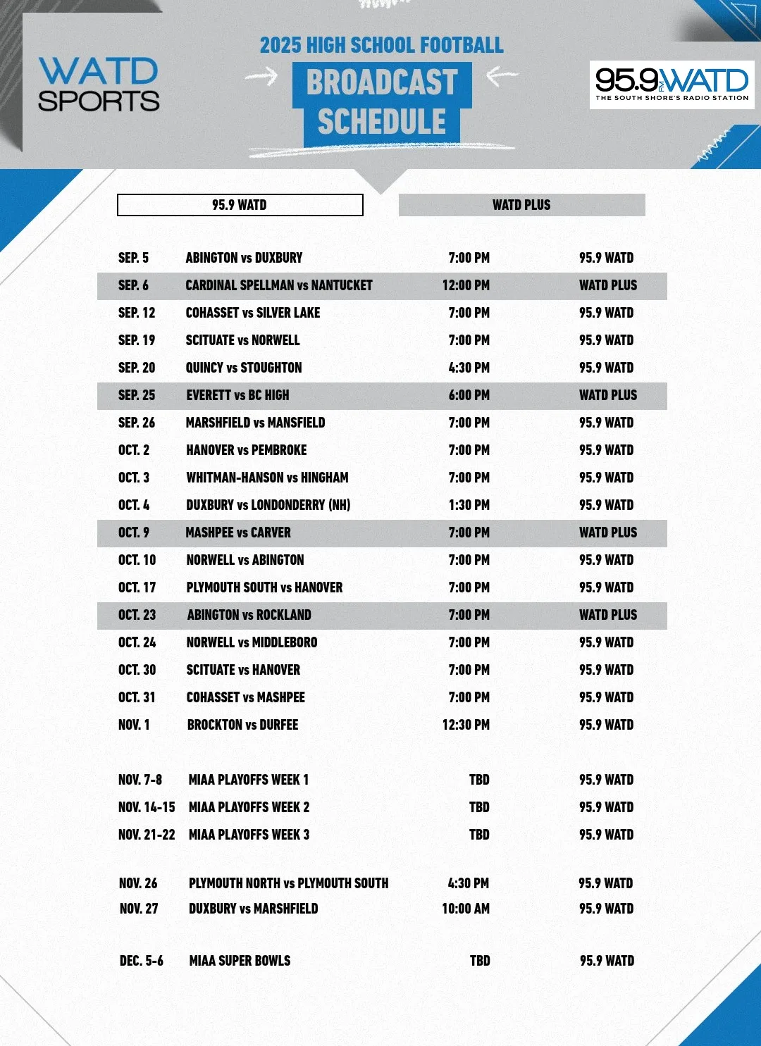 The high school football season begins on Friday, September 5th, as Abington hosts Duxbury on 95.9 WATD in our first South Shore Game of the Week of 2025.