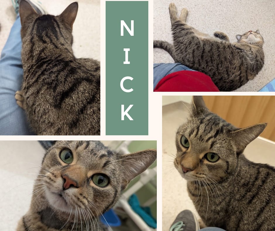 Nick is an estimated 7-year-old cat who came to the Quincy Animal Shelter as a stray, so his history is unknown. He’s very affectionate and loves being around people, but he can become easily overstimulated and may grab ankles when his energy runs high. Nick would do best with a cat-savvy adopter who can help redirect his energy and understand his cues. He may do well with another cat.