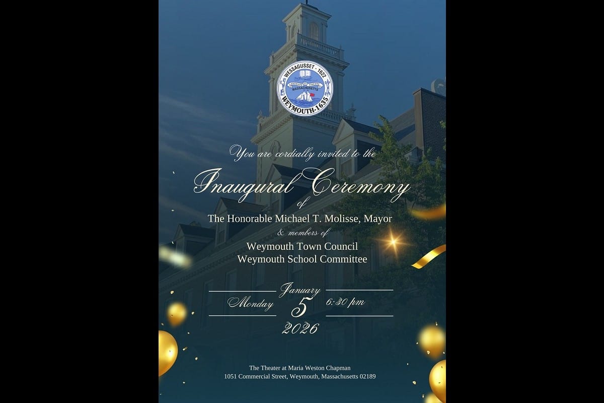 Weymouth Inauguration Day will take place this evening at 6:30 p.m. at the Theater at Maria Weston Chapman Middle School, 1051 Commercial Street in East Weymouth.